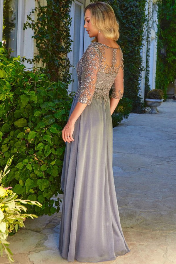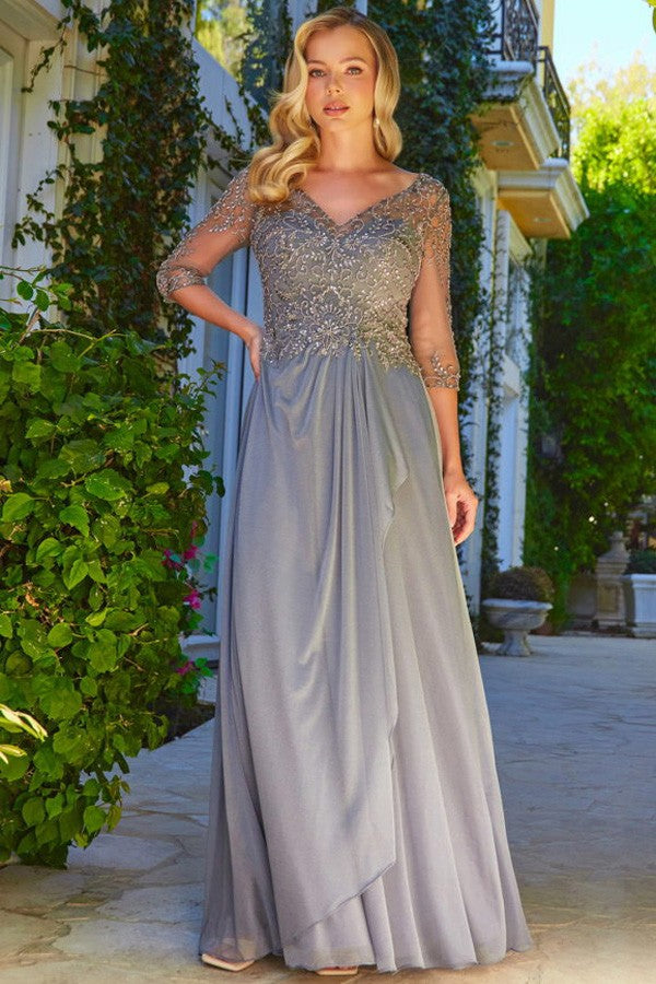 3-Quarter Sleeve Deep V Neck Embellished Top Mother of the Bride Dress Features: Illusion Design, Beads/Sequin/Embroidery Detail, Metallic Chiffon Colors: Charcoal