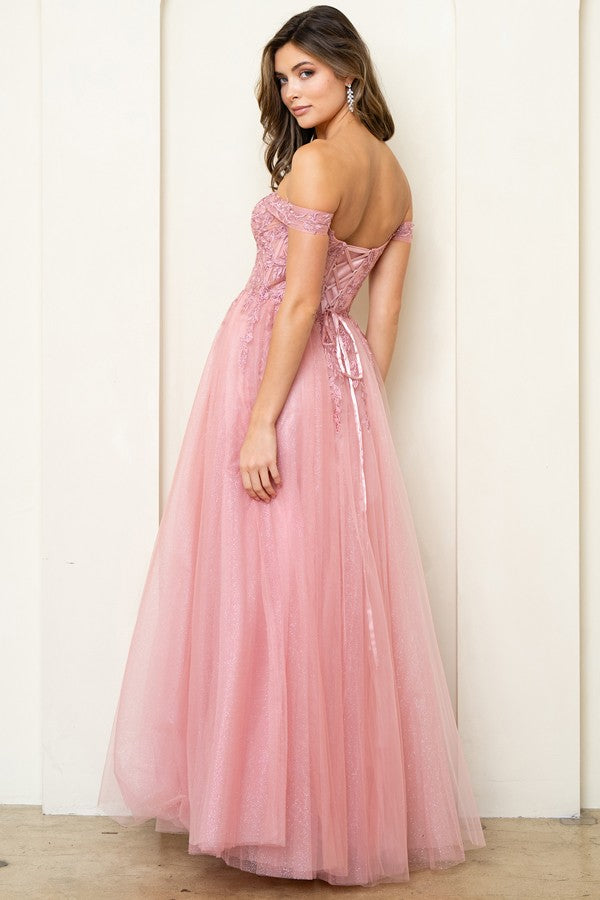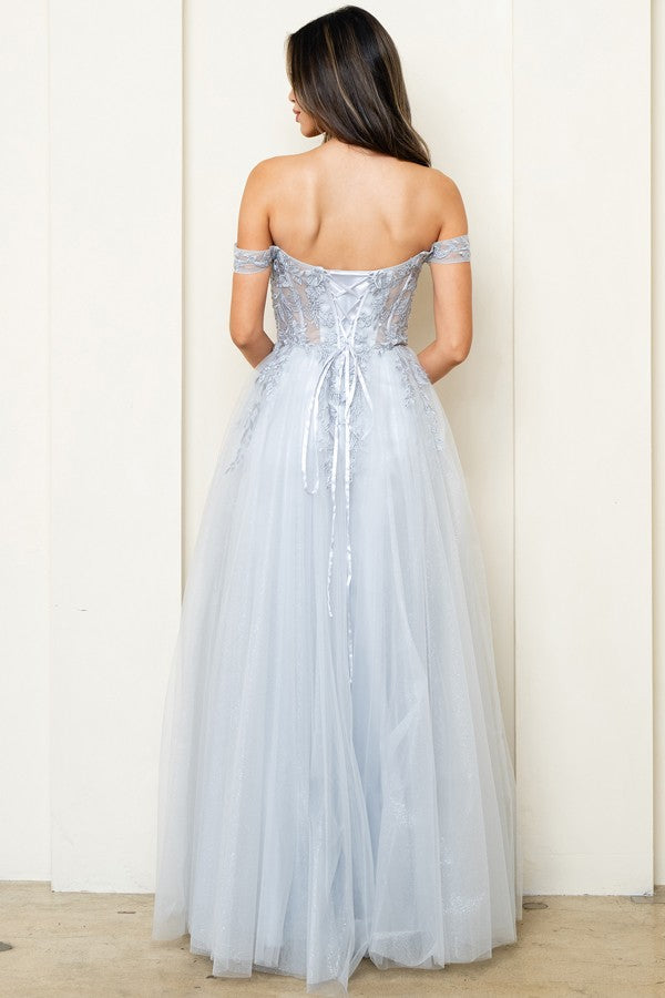 Off the Shoulder Embroidered Top A Line Dress Features: Illusion Top, Thigh High Slit, Floor Length, Open Back, Lace-Up Closure Colors: Dusty Rose, Royal, Silver Sizes: XS-3XL