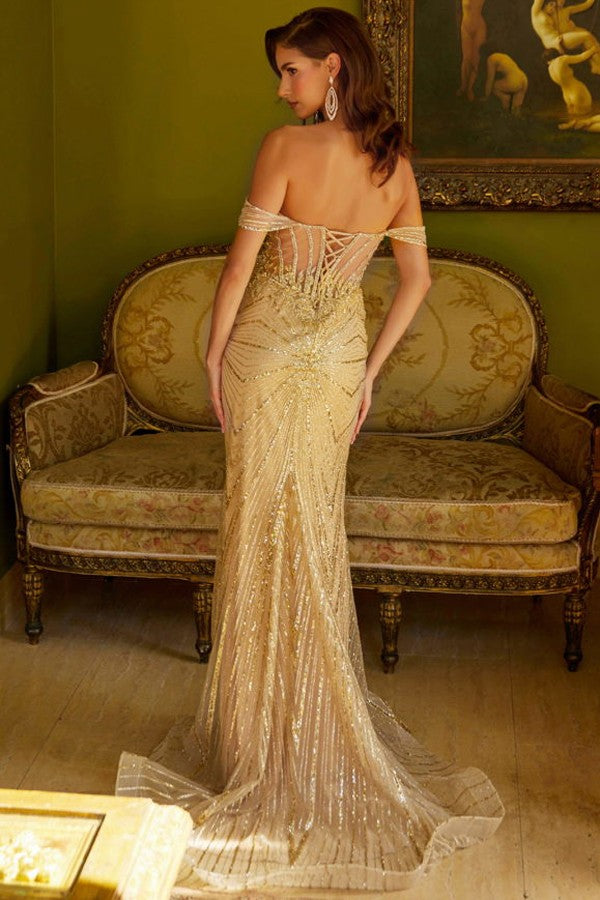 Off-the-Shoulder Plunging Neckline Embellished Mermaid Dress Features: Bead Strips, Bustier Illusion Design, Jewel/Sequin/Bead Design, Horsehair Hem Colors: Champagne Sizes: XS-3XL