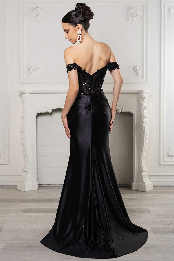 Off the Shoulder Embroidery Top Mermaid Dress. Stretch Satin, Pleat Detail, Bustier Corset. Colors: Black, Gold, Hunter Green, Royal Blue, Teal Blue. Sizes: 4-20
