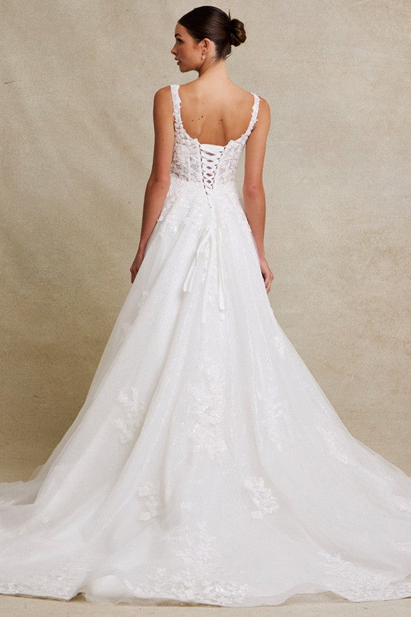 Sleeveless Illusion Square/Scoop Neck A Line Wedding Gown Features: Open Back, Lace-Up Back, Cathedral Length, Floral Bead Detail Take Advantage of $300 FG Free Shipping. Colors: Off White Sizes: S-4XL