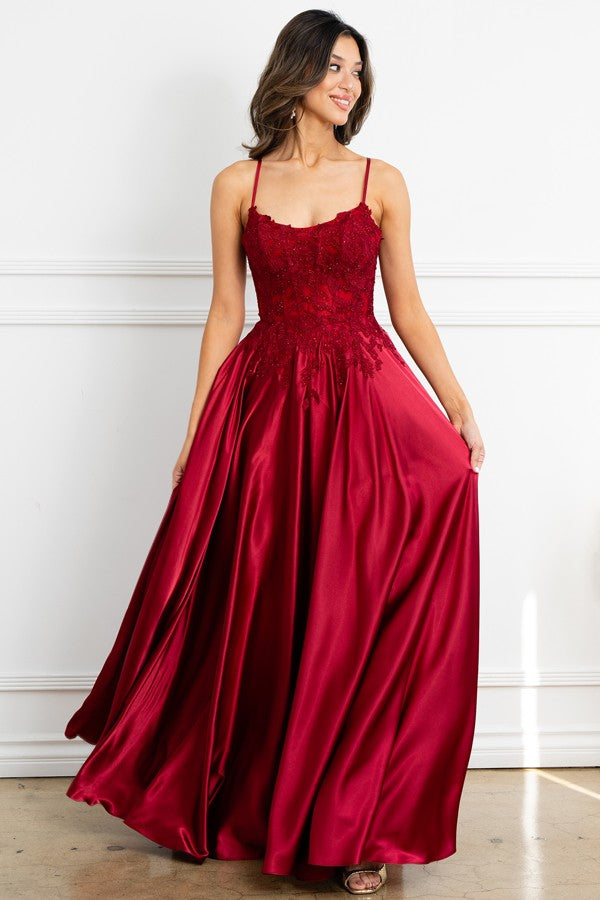 Sleeveless Spaghetti Straps A Line Satin Dress. White Dress is a Simple Wedding Gown. Features: Lace/Embroidery/Rhinestone Design, Bustier Corset, Floor Length. Colors: Black, Burgundy, Hunter Green, Off White, Royal Blue Sizes: XS-3XL
